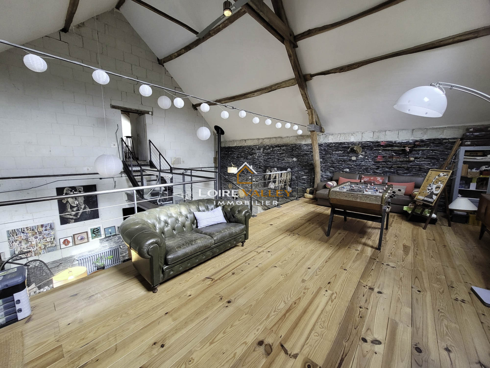 L'étage offre un espace détente / jeux avec sa mezzanine de 40 m² ainsi que trois belles chambres et une salle de douche.
